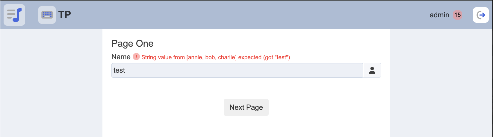 - Page One: The user is required to enter a name. A validation rule ensure that only predefined names are accepted. If the validation is successful, the user may proceed to Page Two.