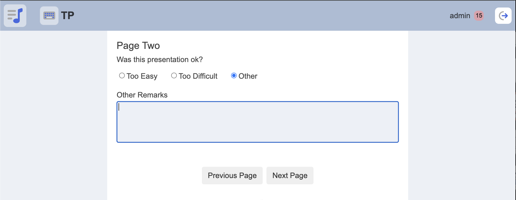 - Page Two: The user answers a radio button question, If “Other” is selected, an additional input field labeled “Other Remarks” will be displayed. After completing the question, the user may proceed to Page Three.