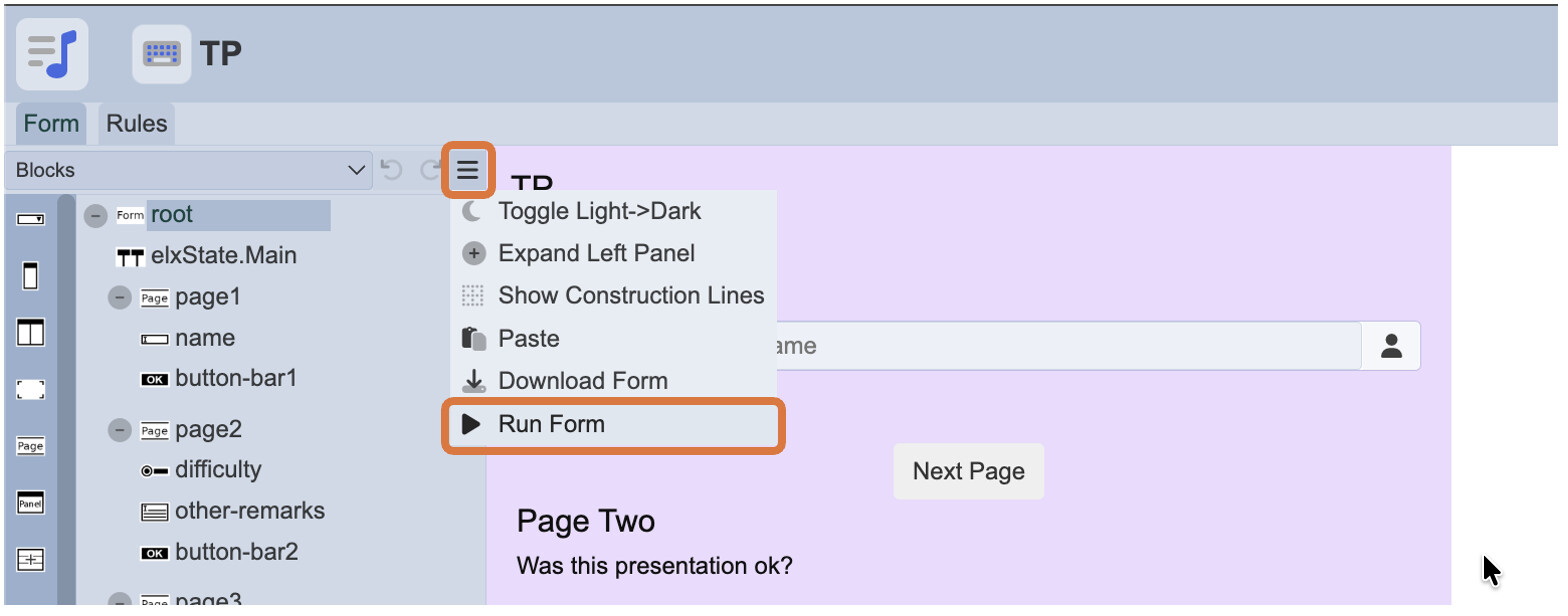 1/ In the Form Designer, click on the 3-line menu icon followed by the option “Run Form”.