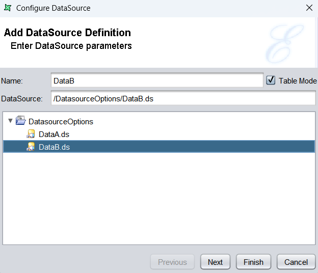 Add DataB.ds as a second datasource for the report template. Name the second datasource explicitly as DataB to keep the configuration clear and consistent.