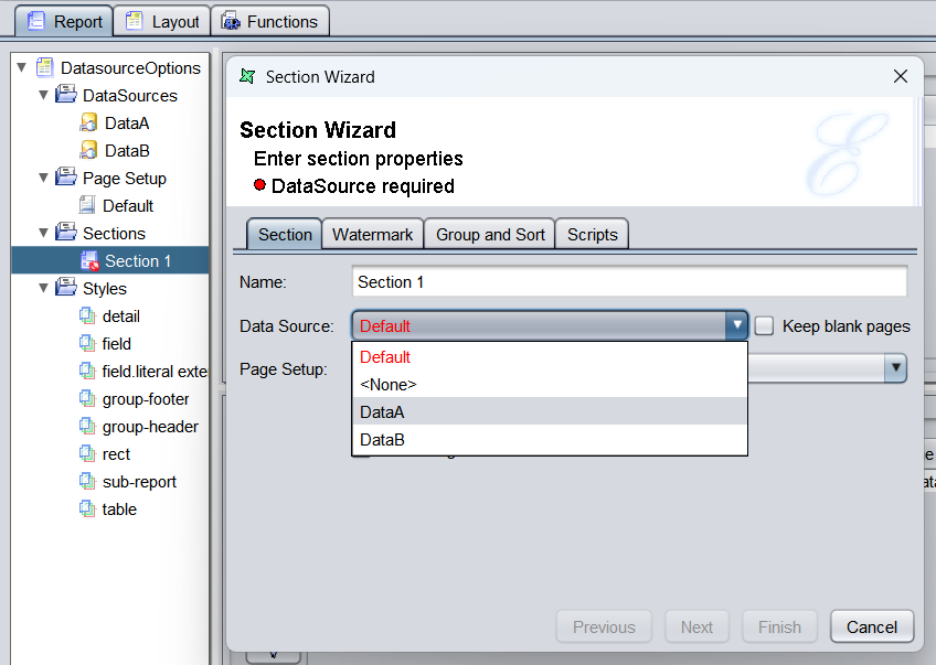 DataChoicedropdown to select betweenDataAandDataB. - Confirm that the report switches datasources correctly at runtime.