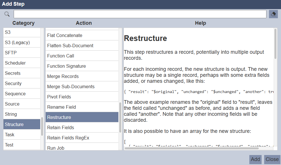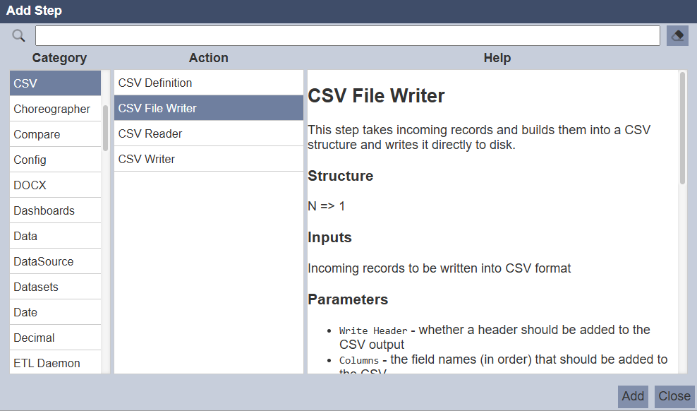 If your column names contain lowercase letters or need renaming, add a Restructure step to ensure compatibility with the CSV File Writer.
