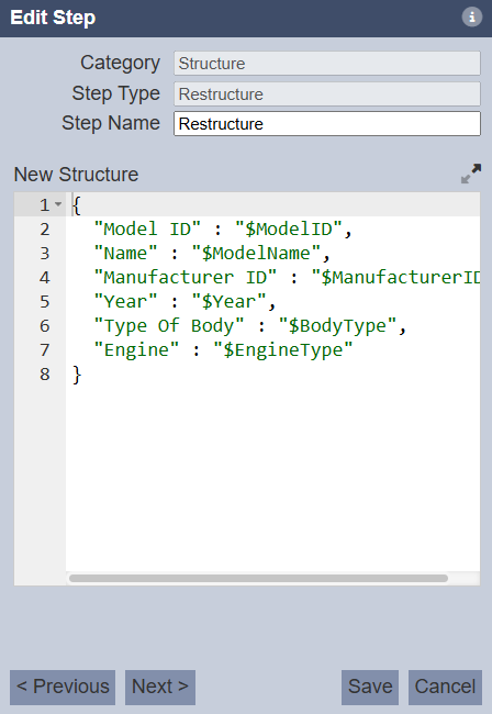 { "Model ID" : "$ModelID", "Name" : "$ModelName", "Manufacturer ID" : "$ManufacturerID", "Year" : "$Year", "Type Of Body" : "$BodyType", "Engine" : "$EngineType" } - Save the step.