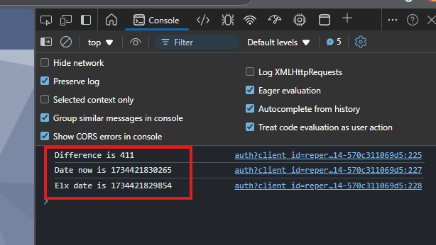 Here, Date.now() reflects the browser timing, while elxNow is the Repertoire server timing. Once you have added the above, please save the file and restart the server.